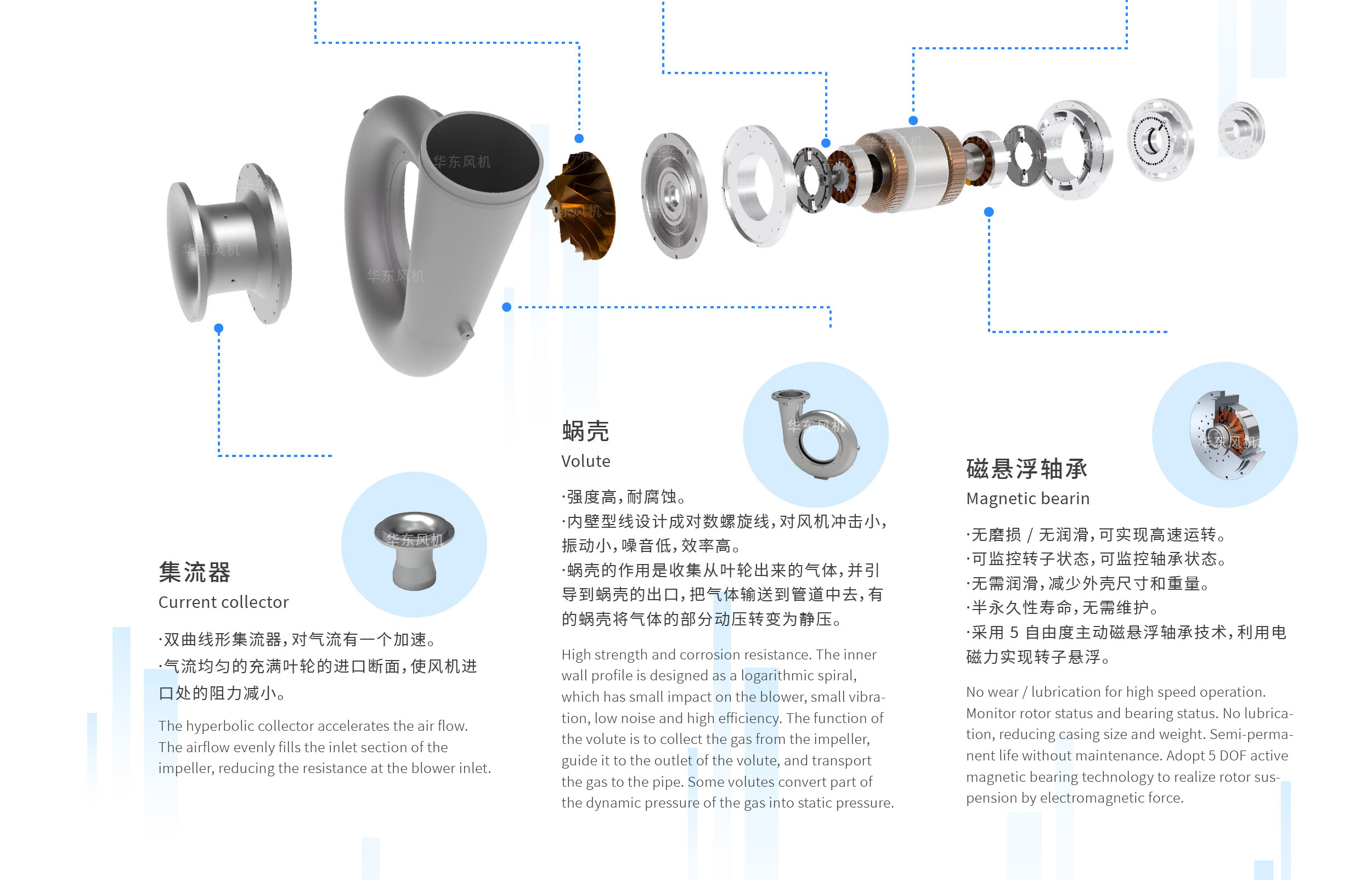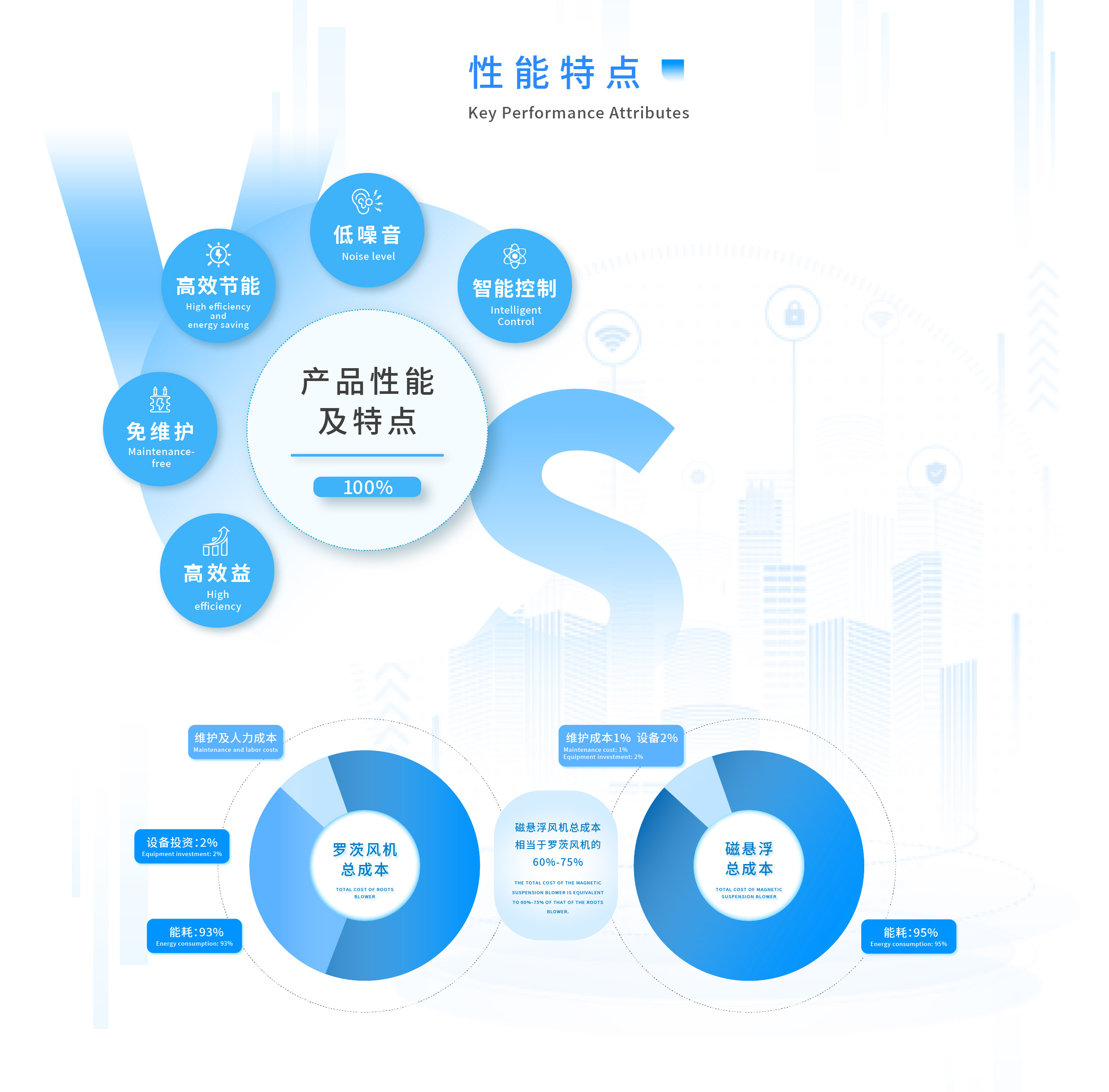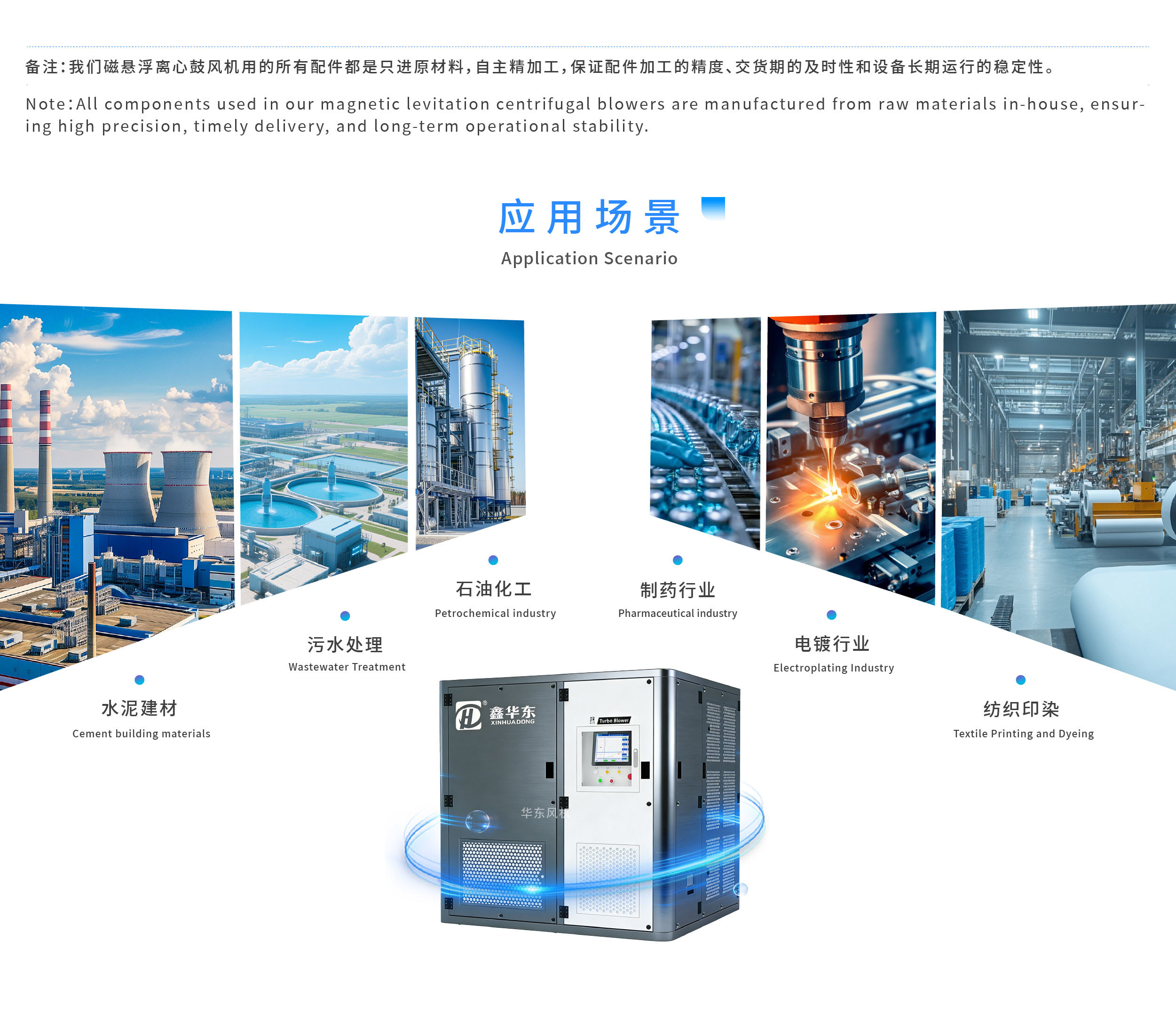 磁悬浮高速离心鼓风机是将磁悬浮轴承技术和高速电机技术融入传统风机之中所形成的一种高效节能环保的新型鼓风机,具有结构简单、高效智能、一体化、操作维护简单、运行费用低的显著优点,可广泛应用于污水处理(市政、工业及其他)、物料输送、食品医药、纺织印染、皮革造纸、玻璃制造、钢铁冶金、烟气脱硫等项目中,节能效果显著。