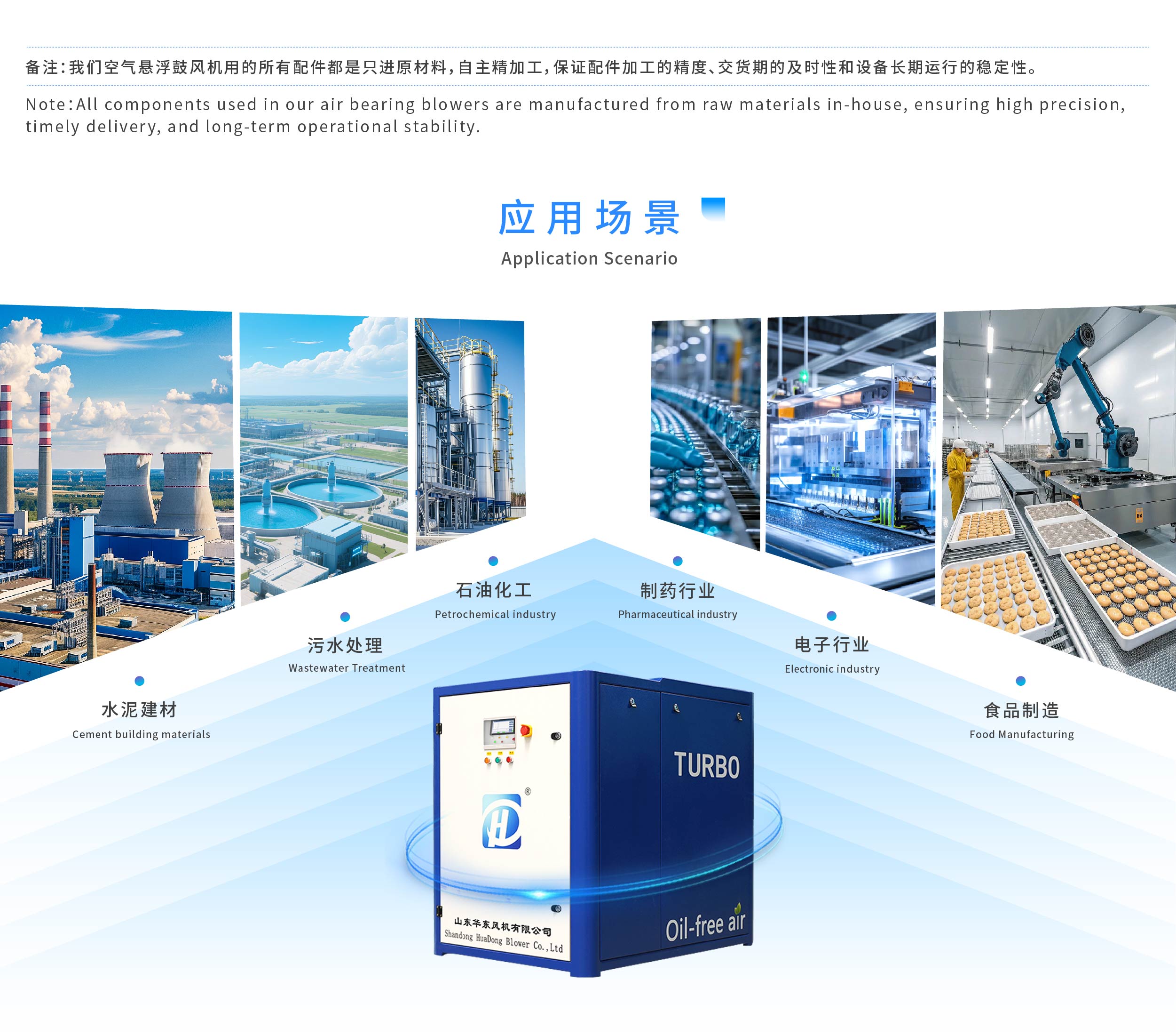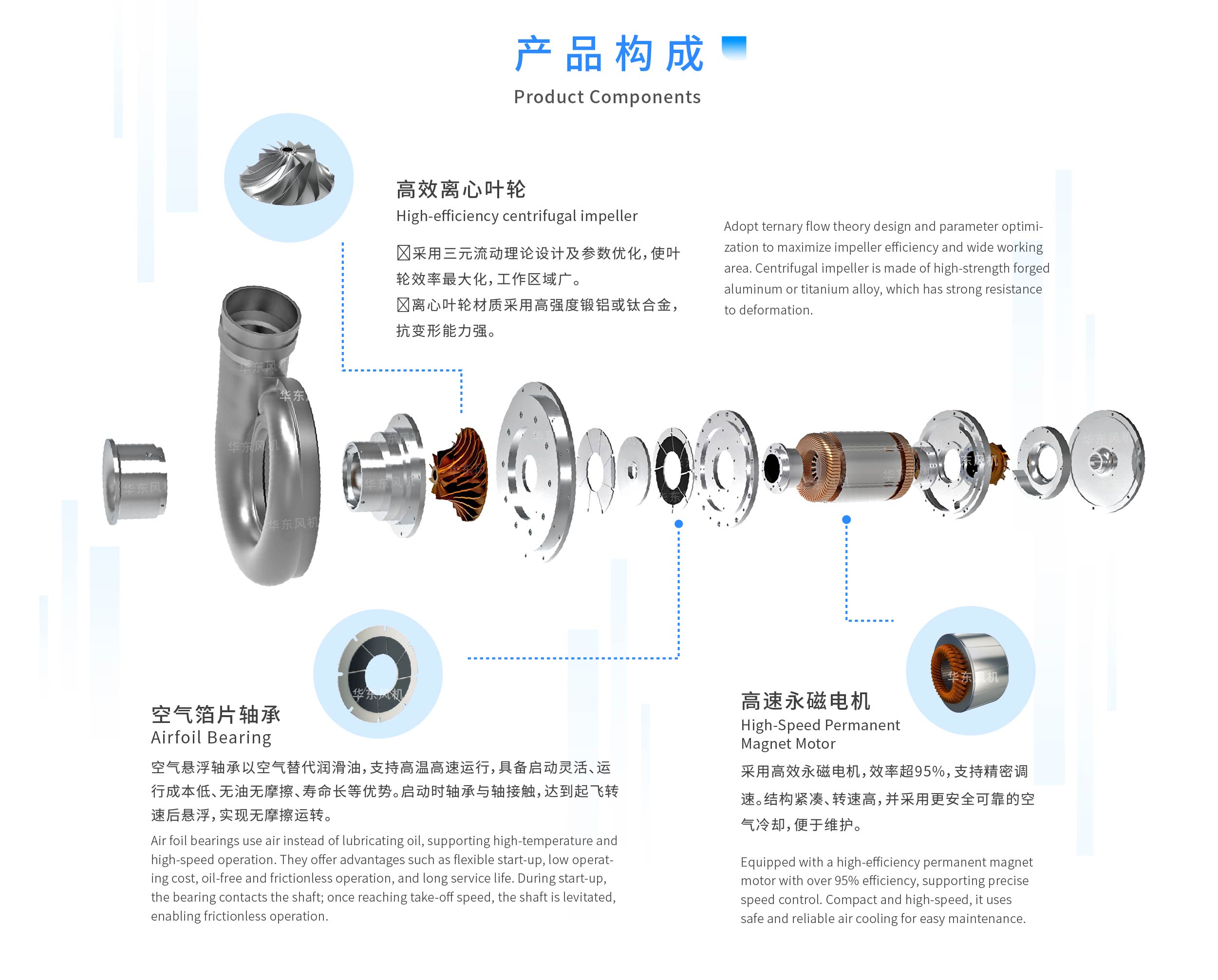 The airfoil bearing turbo blower adopts the air suspension bearing technology. When the blower starts, the rotor rotates at a high speed of 6000-10000 RPM or above. A compressed air film is generated between the rotor and the air foil bearing, allowing the rotor to be completely suspended above the air film during operation, achieving zero friction and zero wear. Combined with a high-speed permanent magnet motor for direct drive of the three-dimensional flow impeller, there is no need for a gearbox, coupling, or lubrication system. Its core advantages lie in high efficiency and energy saving (up to 30% power saving), lifetime maintenance-free, 100% oil-free cleanliness, ultra-low noise operation, and precise and efficient regulation of air volume and pressure through intelligent frequency conversion control.