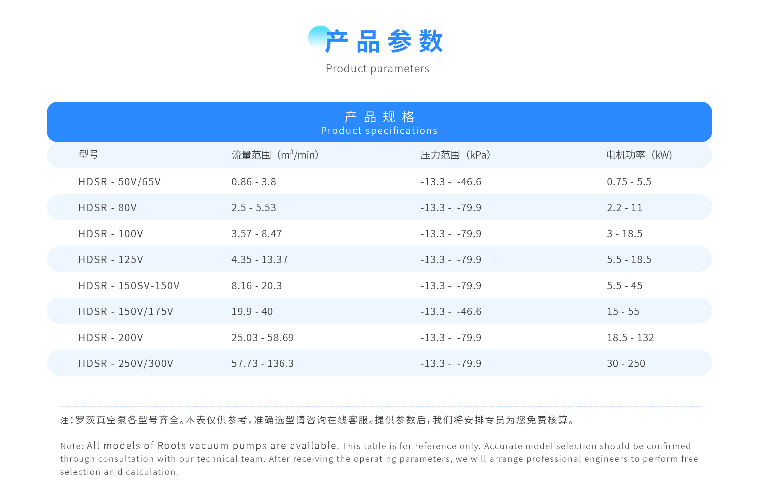 特点:启动快 ,耗功少 , 运转维护费用低 , 抽速大,效率高 ,对被抽气体中所含的少量水蒸气和灰尘不敏感 , 有较大抽气速率 ,能迅速排除突然放出的气体。这个压力范围恰好处于油封式机械真空泵与扩散泵之间。因此 ,它常被串联在扩 散泵与油封式机械真空泵之间 ,用来提高中间压力范围的抽气量。这时它又称为机械增压泵。
