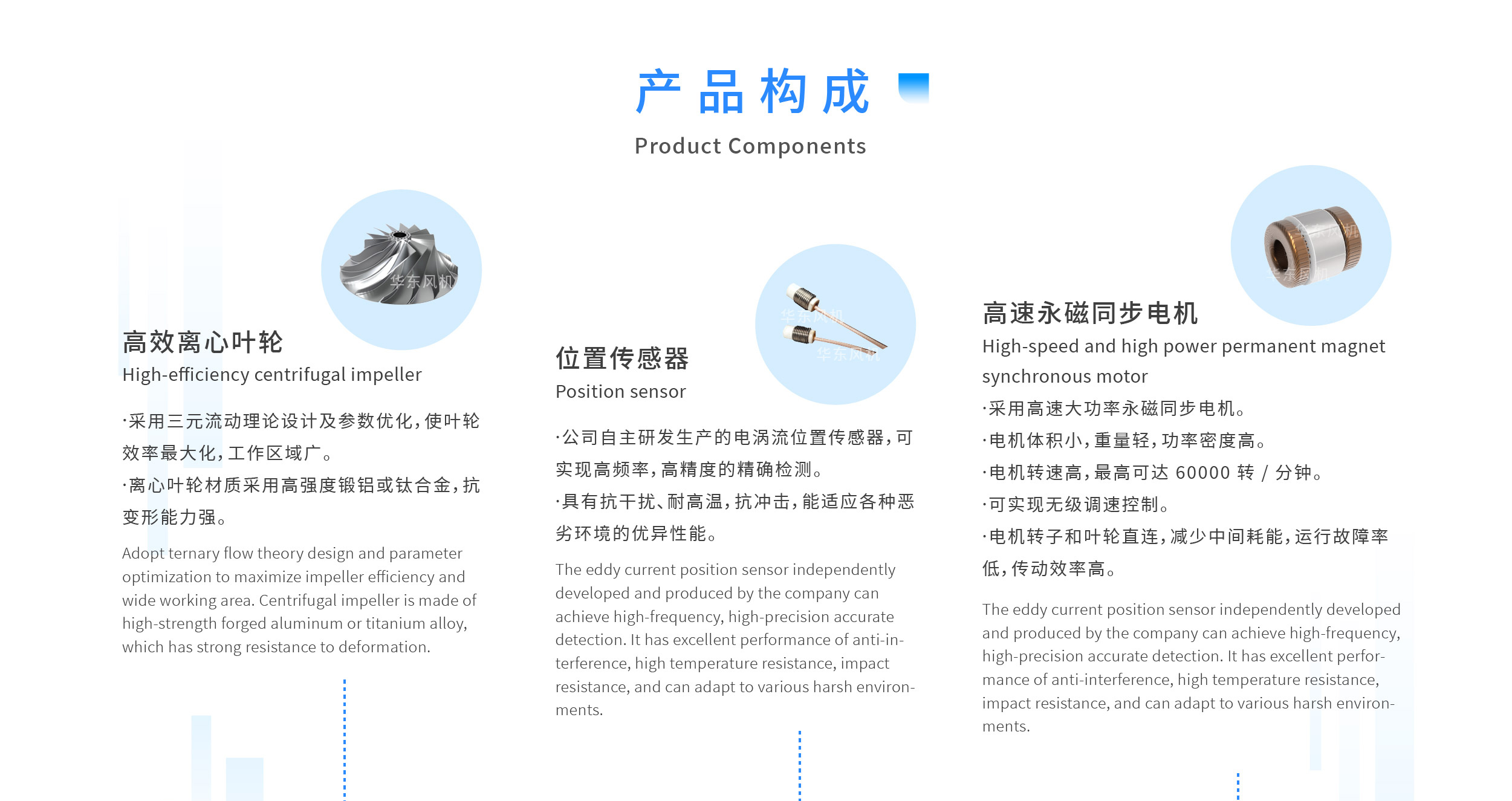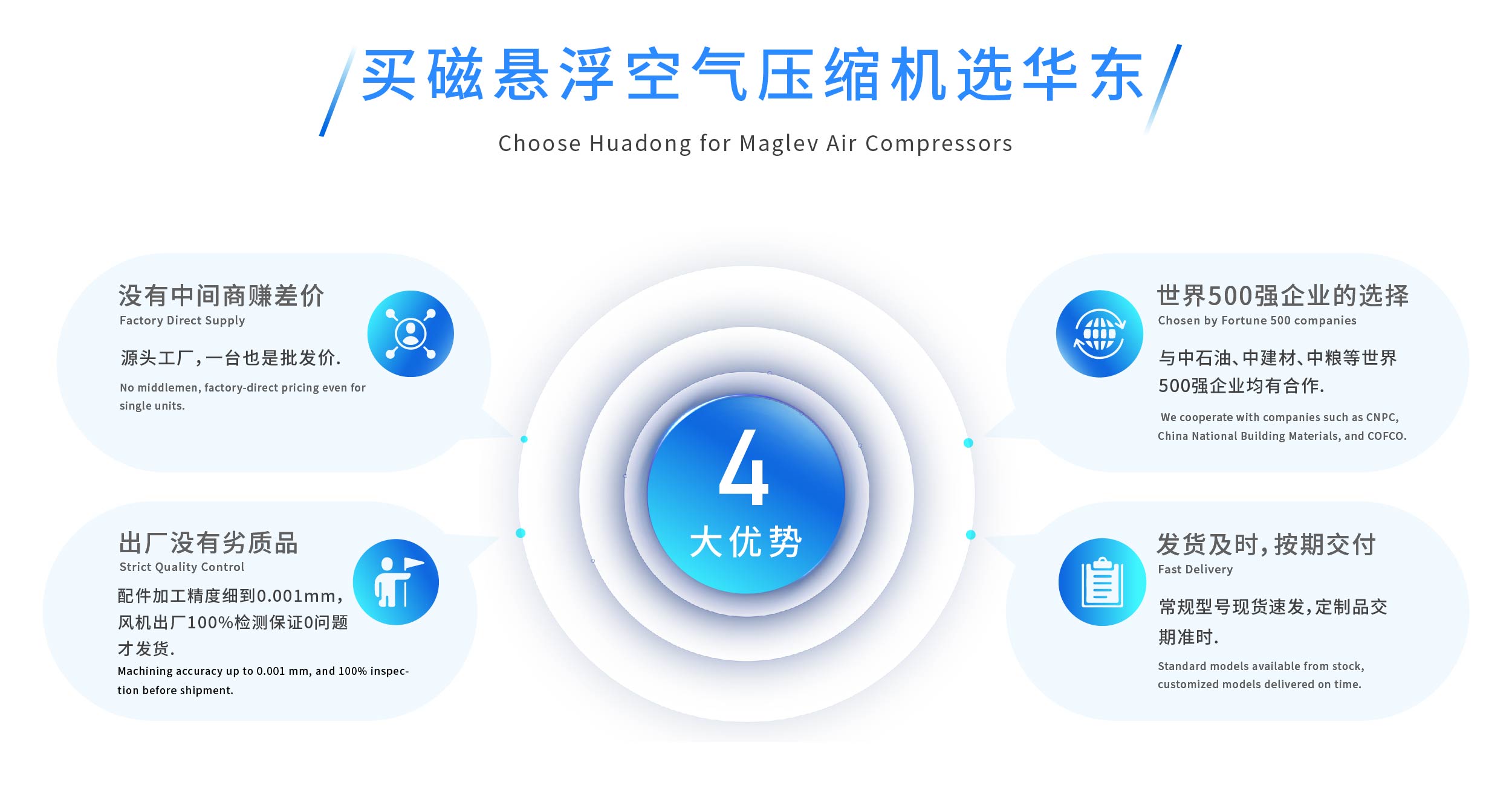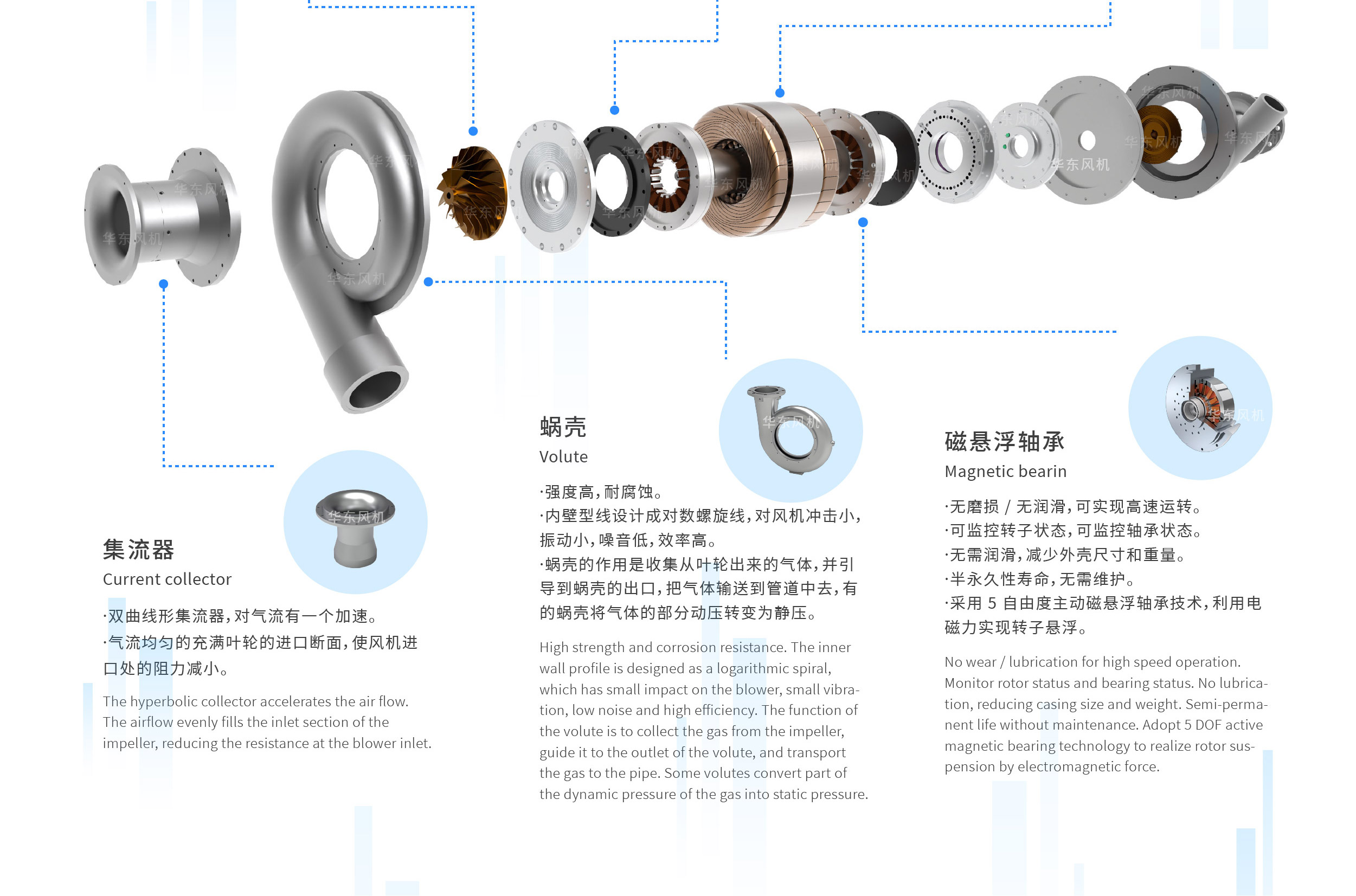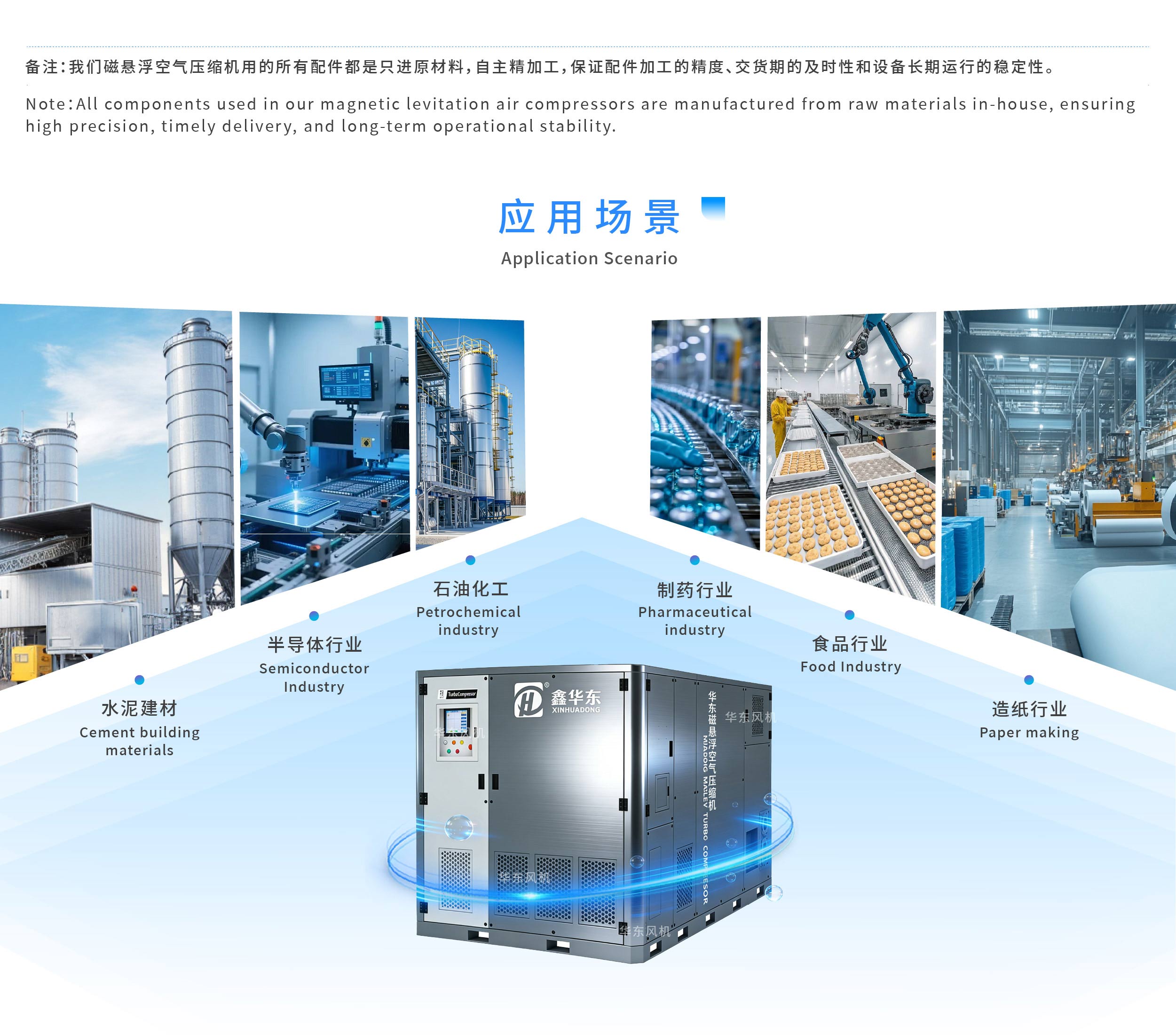 The maglev high-speed centrifugal air compressor is a new type of compressor that integrates maglev bearing technology and high-speed motor technology into traditional compressors. It offers significant advantages, including oil-free operation, no friction, a simple structure, high efficiency, intelligence, integration, ease of operation and maintenance, and low operating costs. This compressor can be widely applied in various industries such as pharmaceuticals, textiles, glass, power generation, mining, food, fermentation, and papermaking, demonstrating notable energy-saving effects.
