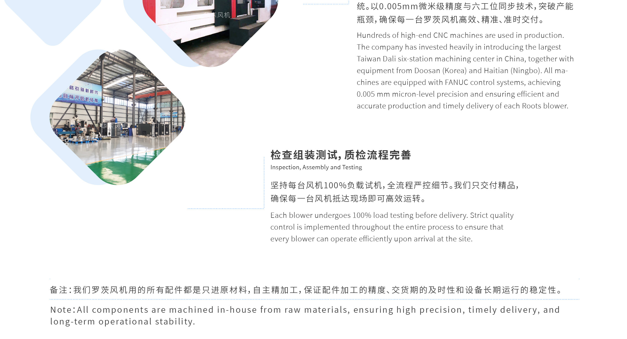 Main components such as casing, end cover, shaft, and impeller are fully manufactured using CNC machining centers. Major purchased components include NSK and FAG bearings, Zhuzhou gears, Gates belts (USA), and TTO rubber oil seals (Taiwan). These components improve blower efficiency, reduce noise, and extend the service life to more than 10 years.