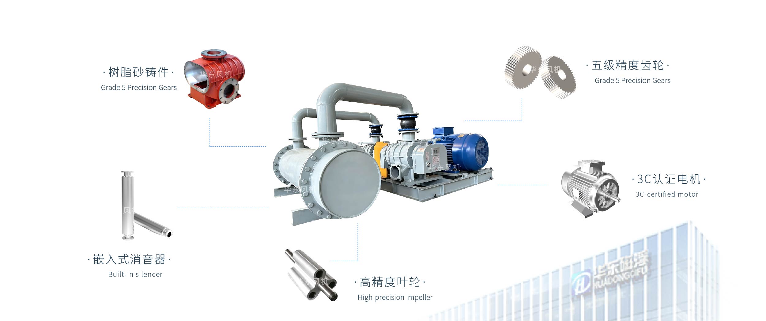 The impellers of the two-stage series-connected Roots blower adopt an involute profile, which is advanced and reasonable, resulting in high overall efficiency, excellent material quality, long service life, and low noise. Forced lubrication is employed, offering high pressure rise, high rotor balancing accuracy, low vibration, and safe and reliable long-term operation. Key components are machined using CNC equipment, and the gears are manufactured to Grade 5 precision, ensuring high product accuracy and reliable operation. The casing and side panels adopt a split structure, facilitating easy maintenance, while the compact design, small size, light weight, and convenient operation and maintenance further enhance usability.