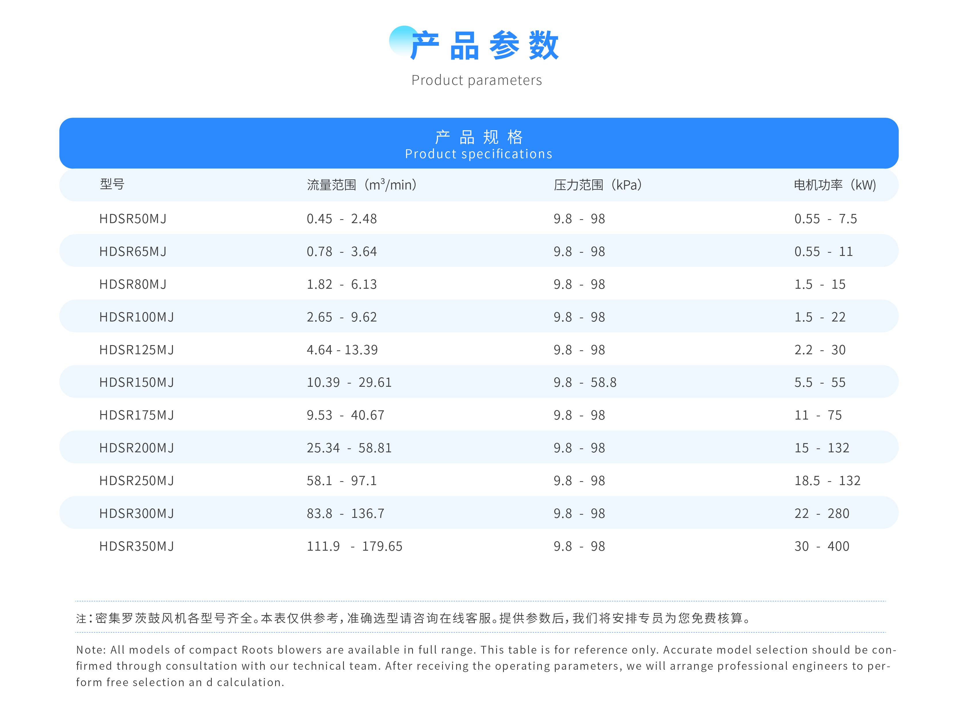 密集罗茨鼓风机是本公司综合了国内外各种型号罗茨鼓风机先进的技术特点的基础上、自动开发的一种新产品。产品的研制开发运用先进的CAD铺住设计和先进的加工工艺,确保了风机性能,并已在国民经济领域:污水处理、面粉、水产养殖、气力输送、电力、水泥等行业得到了广泛的应用。产品风量范围广、分档密、升压高,近20个型号,百余种规格,三叶罗茨鼓风机口径从50到350,各型号详细参数详见各型号介绍。
