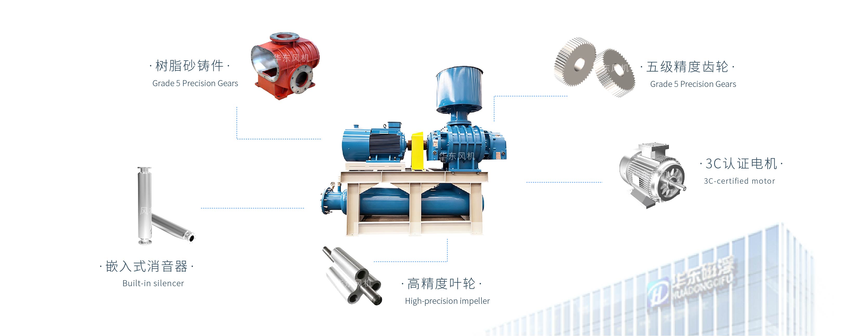 主要配件(机壳、端盖、轴、叶轮)全程采用数控加工中心制作完成,主要外购采用NSK,FAG轴承,株洲齿轮,美国盖茨皮带,台湾TTO橡胶油封,提高了风机效率降低了噪音,将风机的使用寿命延长至10年以上!